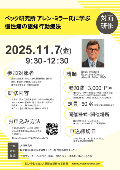 2025年11月7日(金)大野研究所主催、認知行動療法センター共催にて「アレン・ミラー氏に学ぶ 慢性痛の認知行動療法」講演を開催します。アレン・ミラー先生は長年ベック研究所で認知行動療法の普及に努めていらっしゃる先生です。貴重な機会ですので、ぜひご参加をご検討下さい。